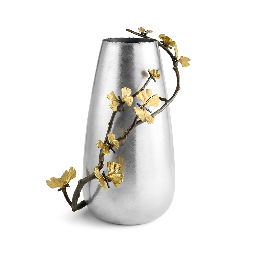 The Butterfly Ginkgo Collection celebrates the representation of flora as fauna. Michael’s fascination with a particular type of ginkgo tree , the Ginkgo Biloba, or “Butterfly Ginkgo”, which grows with a double leaf reminiscent of a butterfly’s wings, gave rise to a fantasia image of the plant. Executed at the highest level of handcraftsmanship, each piece is rendered in solid brass with hand etched cocoon-shaped vessels.